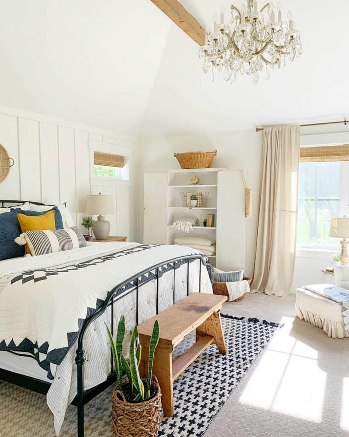 A little color wakes up all the neutrals. Here, mustard pillows play off black metal bed rails and a graphic quilt. I’m into the mix of farmhouse and boho. Bring in one bright accent, then repeat it once across the room, like in a book stack or small vase, so it looks intentional.