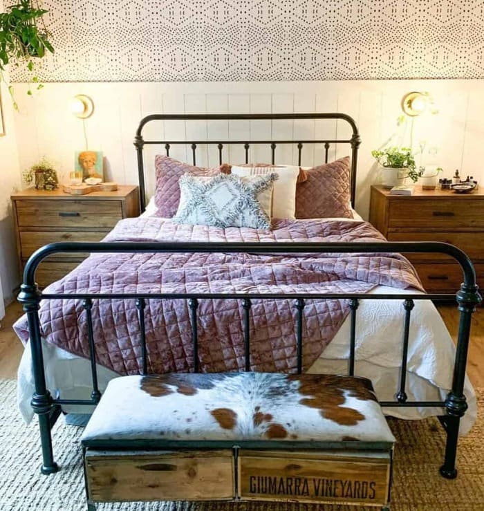 This combo made me smile when I grabbed it off Instagram. The mauve quilt is cozy and romantic, while the cowhide bench and fruit-crate base keep it grounded and a little wild.