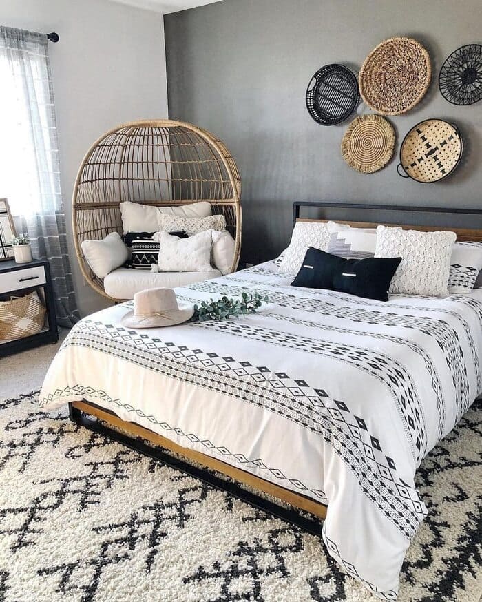 That round rattan chair is the definition of “I’m not moving for an hour.” The black, gray, and white scheme stays chill while the basket gallery adds soul.