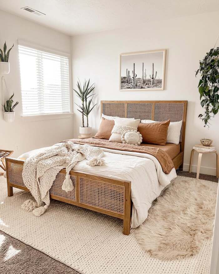 Cane furniture is still having its moment, and I’m not mad about it. The camel duvet, snow-white sheets, and chunky tassel throw feel like a mini vacation in Palm Springs. Keep the palette sand, white, and terracotta, then layer rugs a flatweave under a small sheepskin.