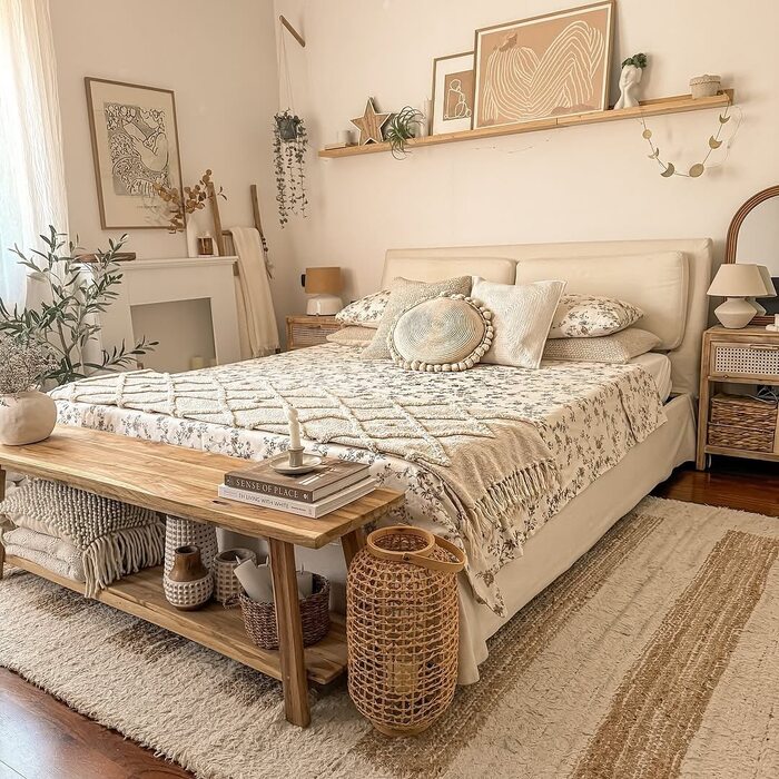 This space hits my sentimental side. It looks collected over time, not rushed, which is very boho at heart. The bench holds folded throws, the low shelf shows off art and a little star, and the quilt adds tiny florals without chaos.