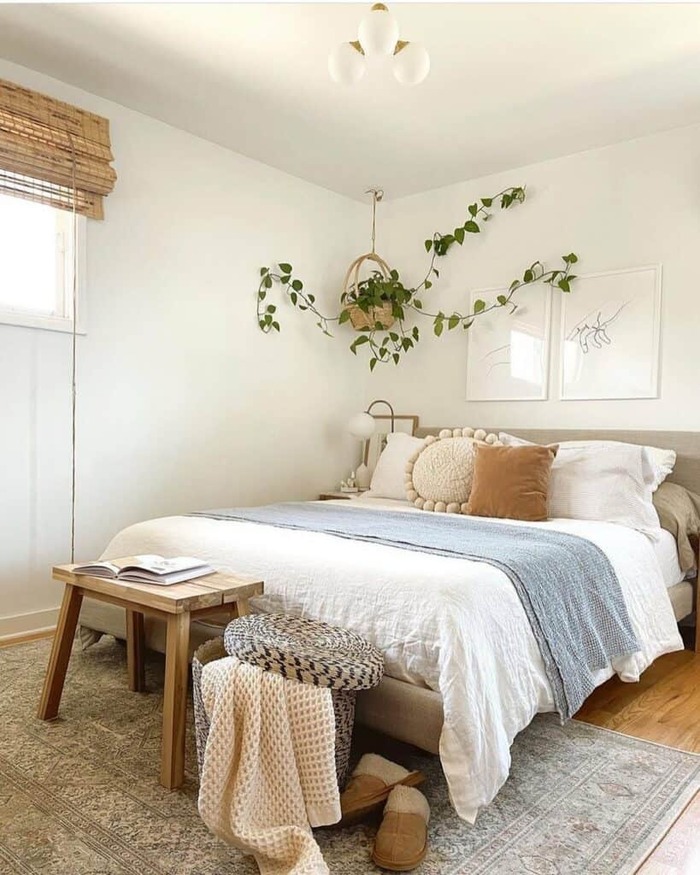 Try this: Keep your palette to three notes white, honey wood, and leafy green. Add one big knit, one fuzzy pillow, and one woven basket. Hide extra linens in under-bed drawers so the room still breathes.