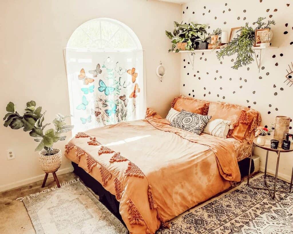 This is where the boho spirit gets spicy. Playful dots, butterfly curtain, and tangerine sheets. If you’re scared of pattern on pattern, keep the scale different. Tiny dots on the wall, larger medallions on the rug, plain sheets with textured trim. The key is repeating a color family. Warm rust shows up three times.