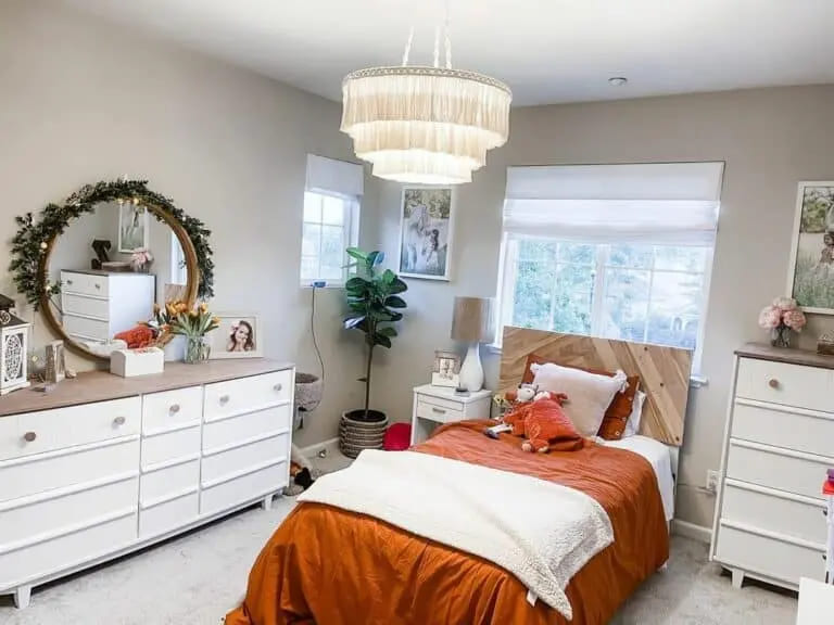 A small room can still be bold. The punchy orange reads happy against all the crisp white chests and that round mirror wrapped in faux greenery. I’m big on round mirrors for boho because they soften all the rectangles.