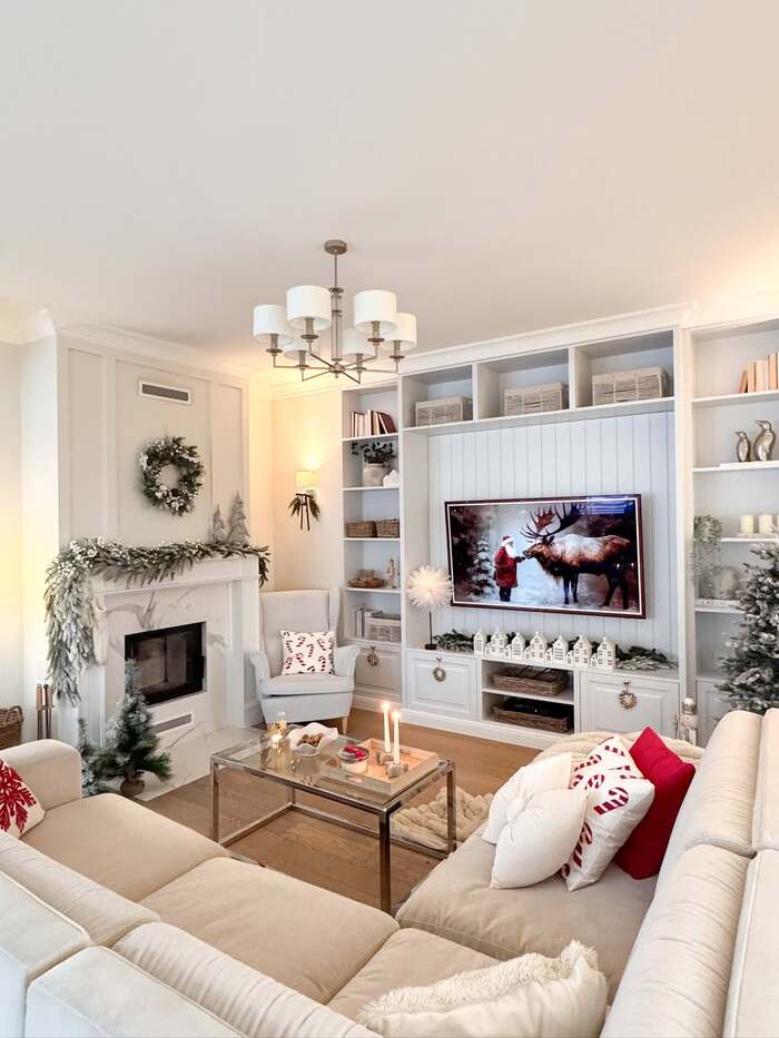 Boho Christmas Decor: Cozy Cream Living Room With Built-Ins