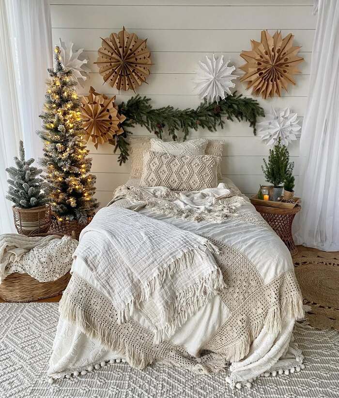 Tell me you don’t want to nap here. Layers of chunky knit, gauzy muslin, and crochet drape the bed like a cloud. On the wall, kraft and white paper stars surround a swag of cedar. Two tiny trees twinkle in baskets nearby. This is boho christmas decor at peak cozy. The colors are oatmeal and cream with green and candlelight, which means your brain does not get overstimulated at 10 p.m.