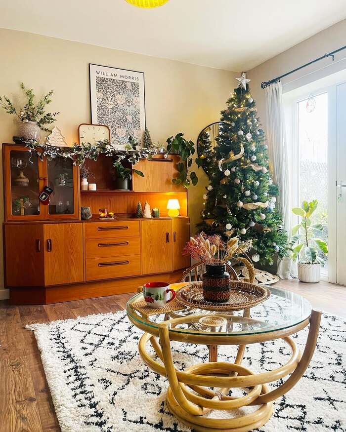Styling tips you can steal fast: add a tiny lamp on the cabinet for a warm amber pool of light, tuck in a few bottle brush trees, and repeat a single material three times. Here it’s rattan from the coffee table tray, the curved base, and the basket by the tree. That repetition is a quiet trick that makes bohemian Christmas decor read as intentional not messy. For variations, think boho holiday decor with wooden beads, clay ornaments, and felt stars. I’d keep the color story to green, cream, and a little brass. It’s calm, it’s grown up, and still fun.