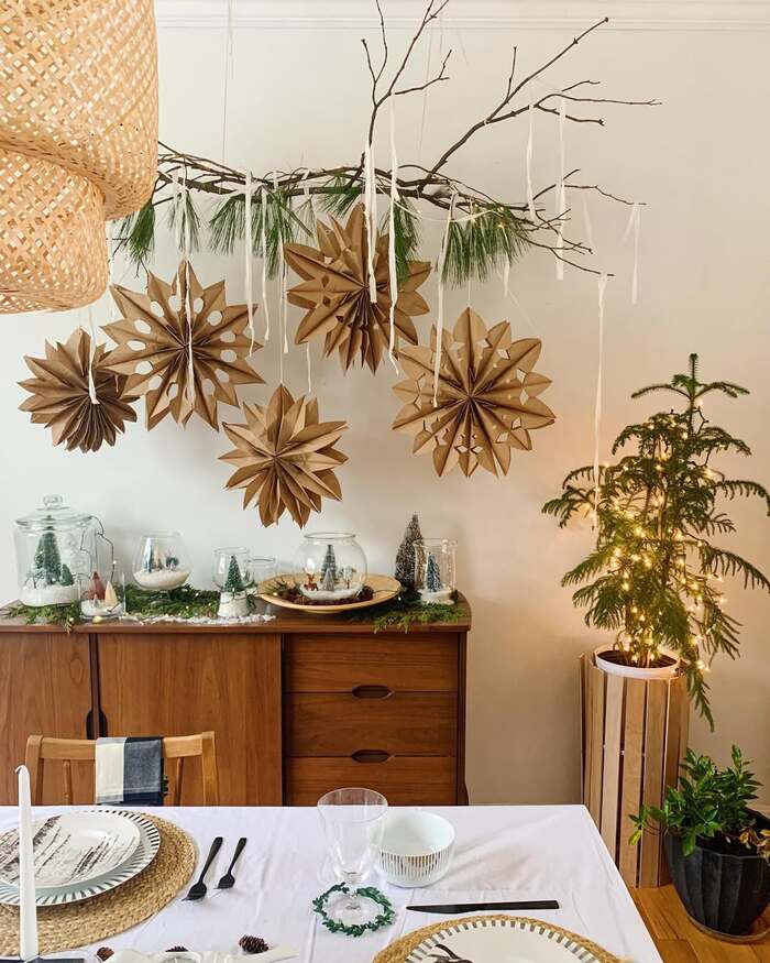 The paper stars are the hero. You can buy them or DIY with brown kraft bags and a glue stick. Hang them at slightly different heights and add long ribbons so everything drifts a little when you walk by. That movement is pure boho holiday decorations energy. On the sideboard, build mini winter scenes in glass bowls with faux snow and little trees. Keep dishes simple on the table so the branch stays the main character. It’s boho festive decor that costs more time than money, and I like that ratio a lot.