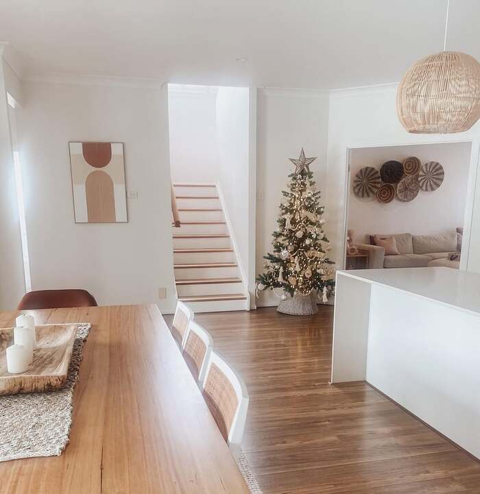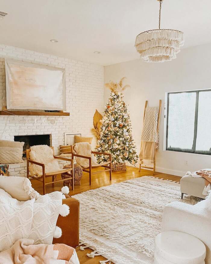 This next room whispers instead of shouts. White walls, honey wood floors, a quiet tree in the corner, and a rattan pendant. I know minimal can look boring in photos, but in real life it feels like a deep exhale. My honest take: if your home tends to clutter, try a less-is-more holiday zone. One tree, one wreath, and a single bowl of pinecones on the table. That’s it. Boho style Christmas works great in neutrals because texture does the talking.