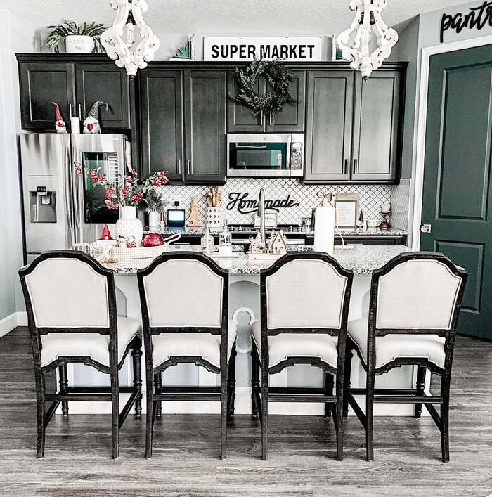 Dark cabinetry can absolutely do Christmas without turning into a cave. In this kitchen the backsplash pattern and black doors create a strong backdrop, so the greenery and tiny houses stand out. I’d hang one wreath over a sign or cabinet and add a second small one on the pantry door to connect the zones. My confession: I once used a bright red bow and it fought the green walls. If your cabinets are dark, let the red come from fruit or napkins and keep bows muted or plaid.