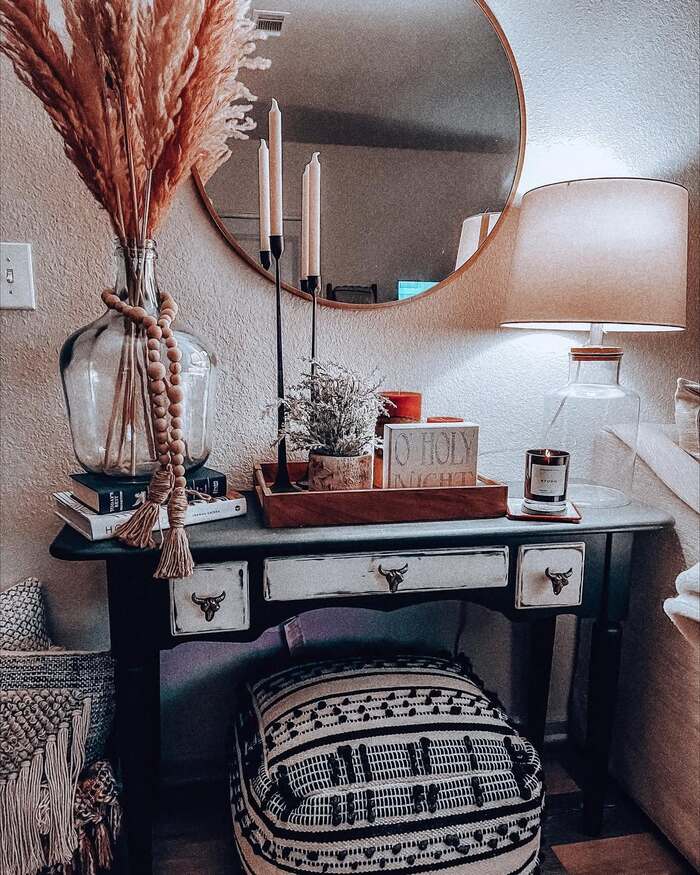 I’m a sucker for a styled console. The mix of pampas grass, wood beads, and skinny candles feels so soft and welcoming. Start with a tray so smaller items look grouped and not random. Add a mini faux tree or two, a stack of books, and a pretty bead garland that drips over the edge. The round mirror pulls light forward which is why this corner looks moody in the good way. If you don’t have pampas, dried grasses from your yard do the job.