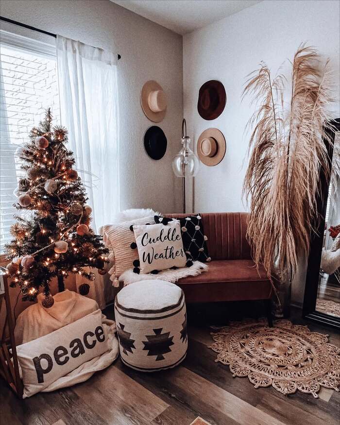 This one made me audibly say oh wow. A small tree tucked beside a little velvet bench, a pouf, a hat gallery, and dried grasses sweeping tall. It’s proof that you don’t need a giant room to make a holiday nook. The hat wall is clever storage disguised as art. Try using three neutral hats and two darker ones, spaced unevenly so it doesn’t feel like a grid. That irregular rhythm is very boho holiday decor and your brain loves it even if you can’t explain why.