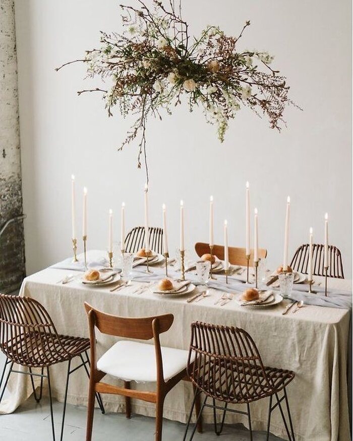 Nothing says handmade magic like a branch suspended over a table. This setup is refined, all cream linens and tall tapers. Here’s how to make it safe and sturdy. Use two ceiling hooks placed into studs, or heavy-duty anchors if you must. Hang the branch with fishing line or thin chain and test it with a gentle tug. Add a few tiny battery lights or leave it bare for sculpture vibes. The secret is negative space. Don’t overload the branch. Two clusters of small florals are plenty.
