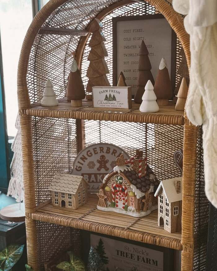 For color, keep it natural wood, whites, and a gentle green so the shelf looks cohesive. If you want candy color, contain it to the gingerbread house and let everything else be muted. That way your eye lands where you want it. This is peak boho holiday decorations meets grandma’s attic in the sweetest way. Also, rattan plus Christmas always works because the texture warms up the winter chill. Put the shelf near a window to catch morning light and boom, instant cheer.