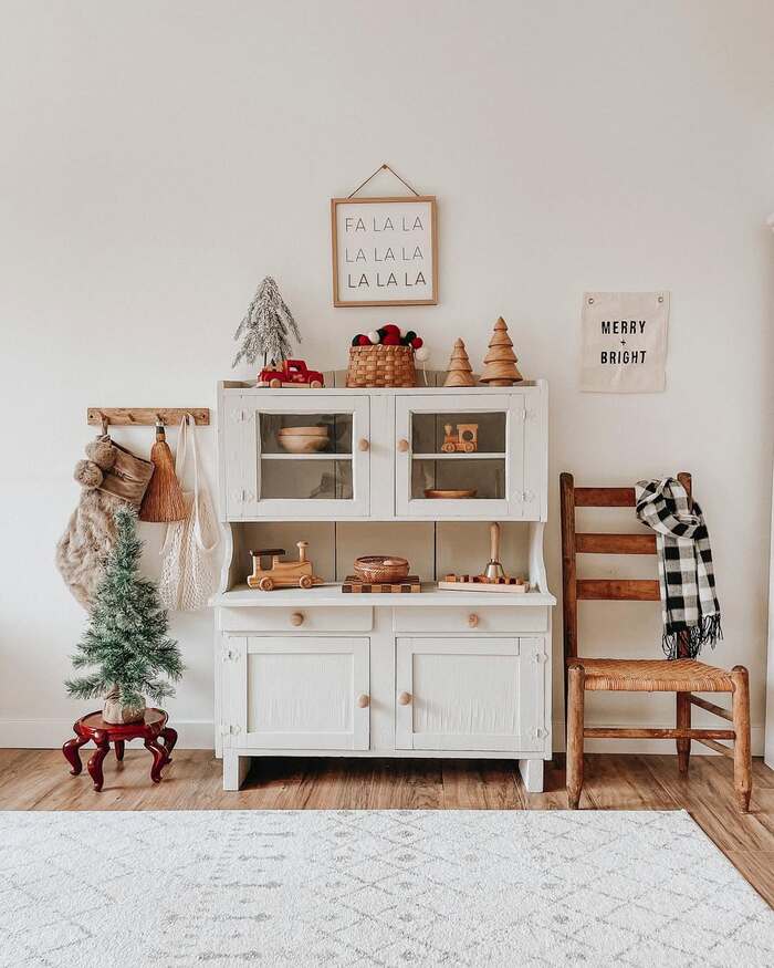 This white cabinet gives quiet cottage energy. Small trees, knit stockings, a little red truck, and lots of open wall space around it so nothing feels cramped. I’d call this boho themed Christmas with Scandinavian notes. To recreate, line the top with three trees of different heights and match the wood tone of your knobs or baskets so the color story connects. If your hutch is cluttered, pack away half the everyday pieces for December. Empty space is a gift.