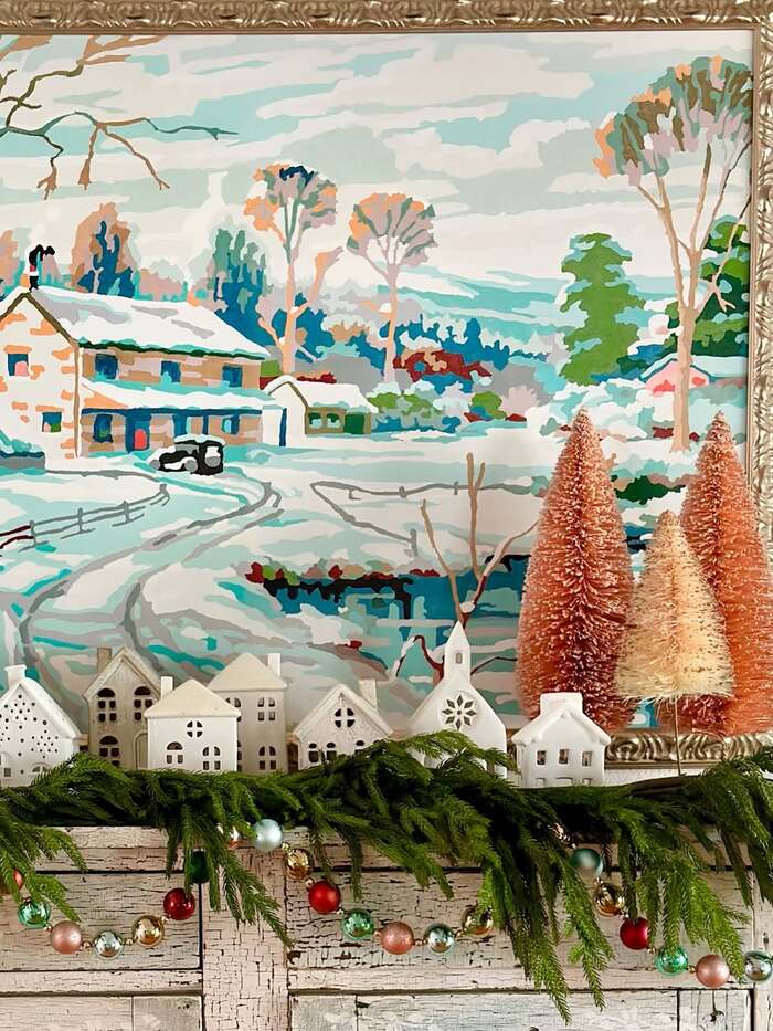 Vintage Winter Mantel With Mini Village And Pastel Trees