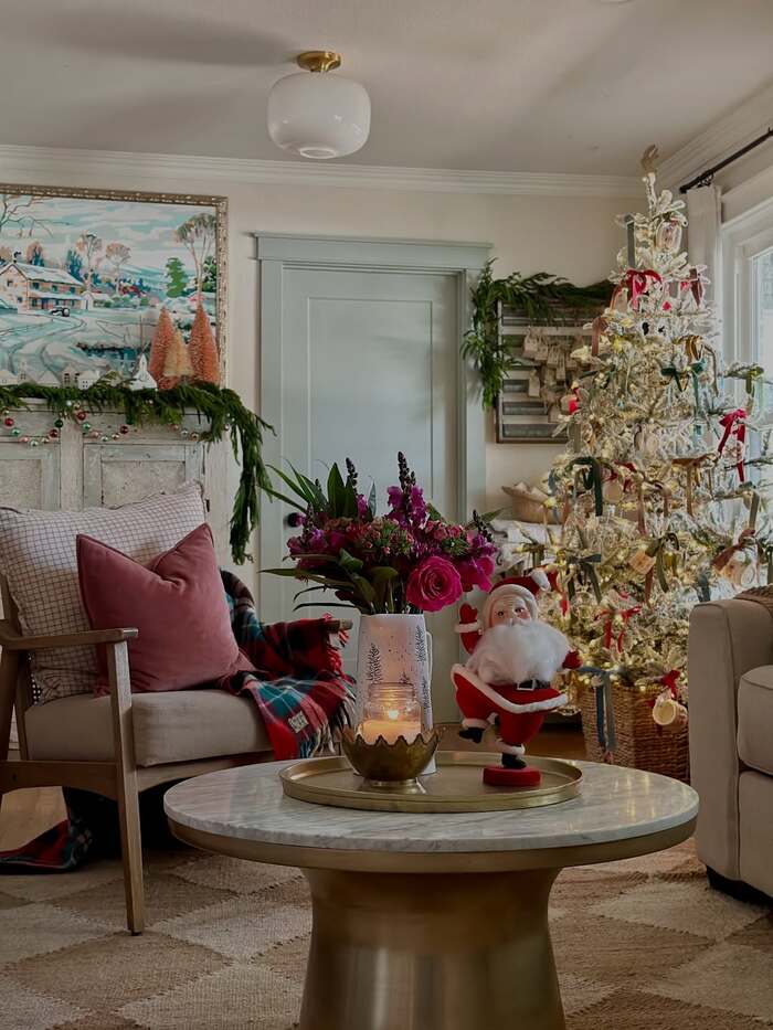 This space mixes glam and handmade. A gold drum coffee table holds a glowing candle and winter flowers, while a slim tinsel tree twinkles nearby. On the wall, that same vintage winter art shows up again, and a felt garland runs along an old door. It’s moody and cozy at once. My favorite detail is the plaid throw tossed on the chair. Bohemian style loves contrast, and plaid next to brass is exactly that.
