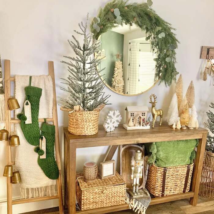 A boho entry should feel like a hug when you come in from the cold. This console does exactly that. A half-wreathed round mirror brings movement. A flocked mini tree sits in a woven basket. Brass bells hang on a leaning ladder beside nubby blankets and knitted stockings. The palette stays natural with hits of green and gold. It’s friendly and functional. You can actually put keys down without knocking over a centerpiece.