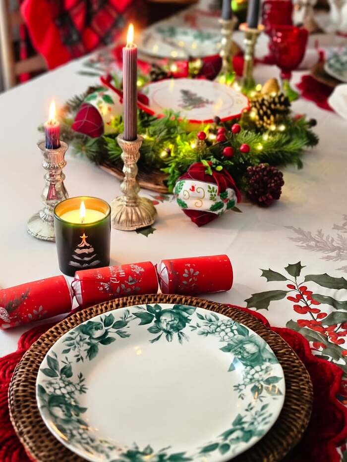 This table feels traditional at first glance, then the details make it bohemian. Wicker chargers add texture under floral china. Black tapers in silver holders give drama. A low wreath centerpiece holds ornaments and tiny lights so guests can actually see each other. The trick is blending high and humble materials. Silver with rattan. Linen with knit.