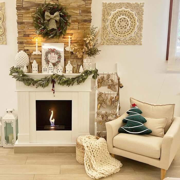 This corner glows. A small bio-ethanol fireplace, stone surround, and a simple garland with little white houses on the mantel. Next to it, an advent ladder holds linen pouches numbered for treats. A chunky knit throw pools on the floor. It reads Scandinavian and bohemian at the same time. Clean lines, soft materials, and that tiny real flame for romance.