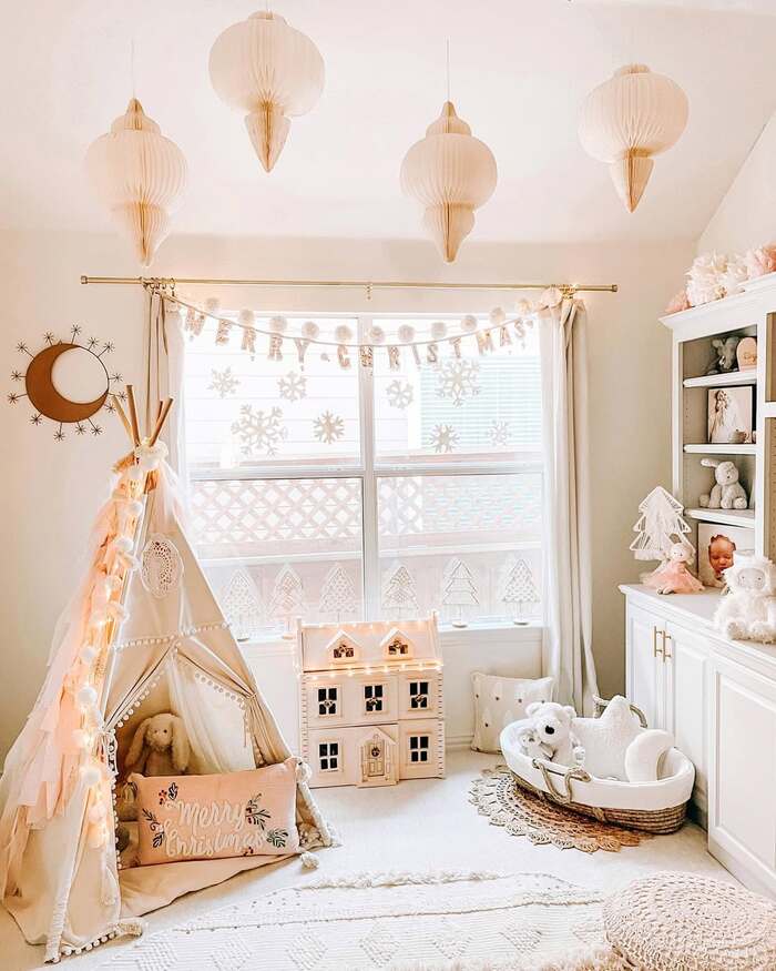 Dreamy Kids Room With Teepee, Snowflakes, And Dollhouse