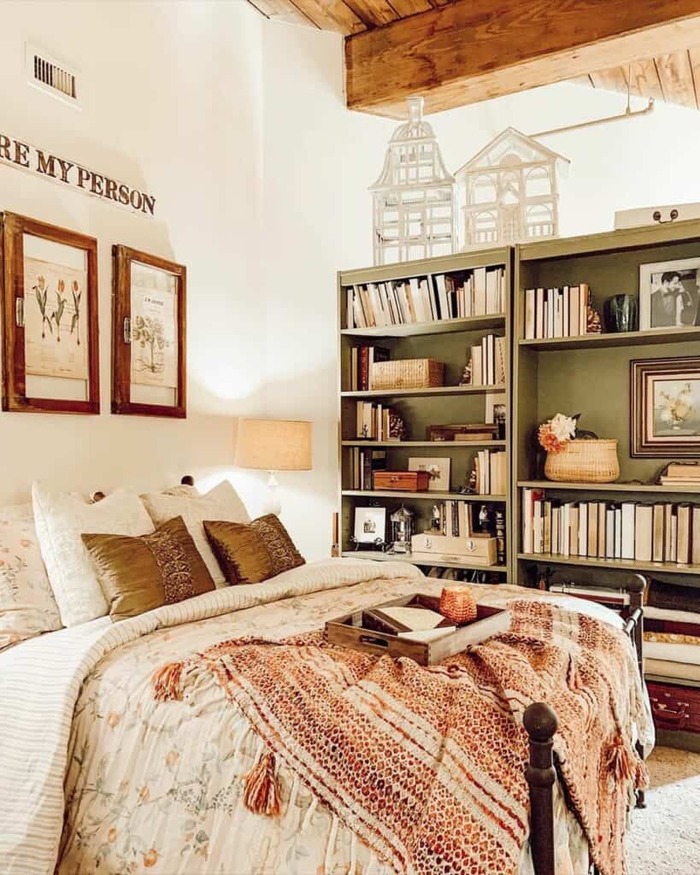 That olive built-in with books and baskets is a whole hug. I’m obsessed. When I design a rustic boho farmhouse bedroom, I turn book spines light or neutral and tuck a few framed photos sideways. It quiets the shelf and keeps it personal. Repeat the olive in a throw or pillow so the room doesn’t fragment. Yes, it’s a small trick, but it works every time.