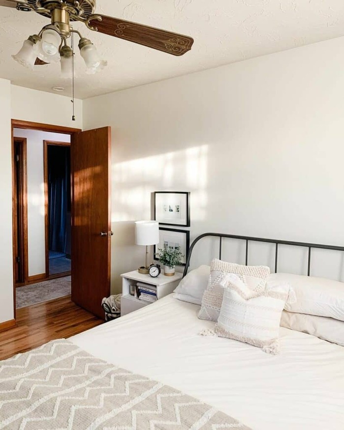 The clean white walls and slim iron bed are proof you can keep it minimal and still warm. Call this a minimal boho farmhouse bedroom. The nubby pillows and zigzag knit at the foot add touch without noise. If you’re renting, steal this move. Paint nothing. Add two textures and one plant. Done.