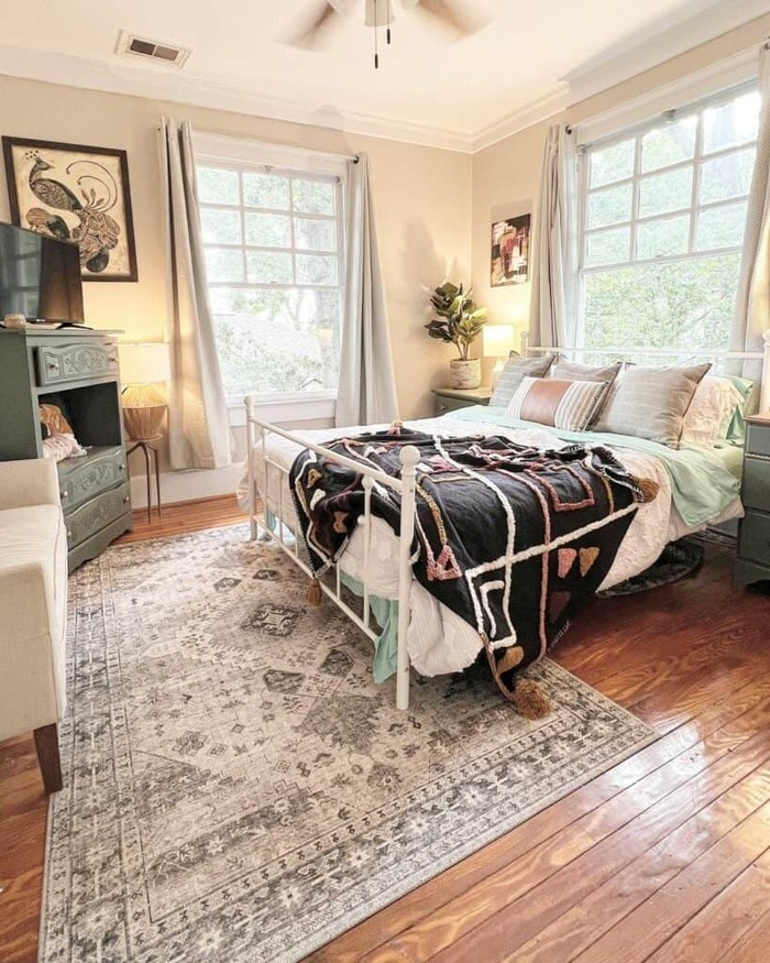 I love paint, but I don’t always trust my own commitment. So I paint the dressers, not the walls. This flexible boho farmhouse bedroom style lets you change mood seasonally. The graphic throw at the foot is the spice. If you fear color, keep the rest neutral and let the throw be the boss.