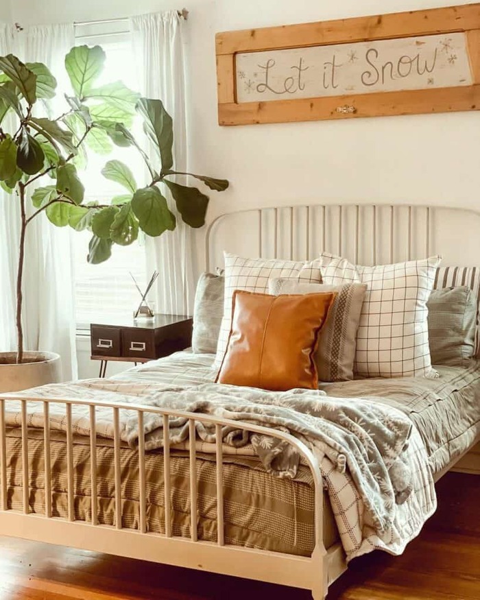 Green plaids, white drapes, one caramel leather pillow. This natural boho farmhouse bedroom shows how to do seasonal without bins. Keep a tall indoor tree for height and life. And please add a cedar or fir reed diffuser. Smell matters more than we admit.