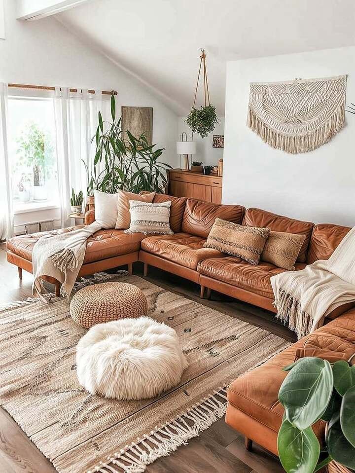 The first room is the reason I started this whole thing. That huge caramel leather sectional basically screams “come sit and nap.” It’s the heart of a warm boho minimalist living room, even though nothing here is technically fancy. The sofa color feels like worn-in saddle leather, which gives instant warmth next to the white walls.