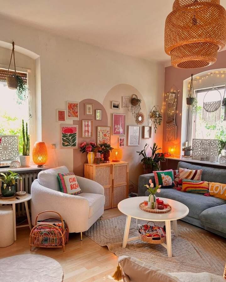 Even with all the color, there’s still a simple base: light floors, mostly white walls, and neutral furniture shapes. That’s what keeps this colorful boho minimalist lounge from feeling cluttered. The decor might be loud, but the big pieces stay calm. It’s like the room has a sense of humor but also does its homework.