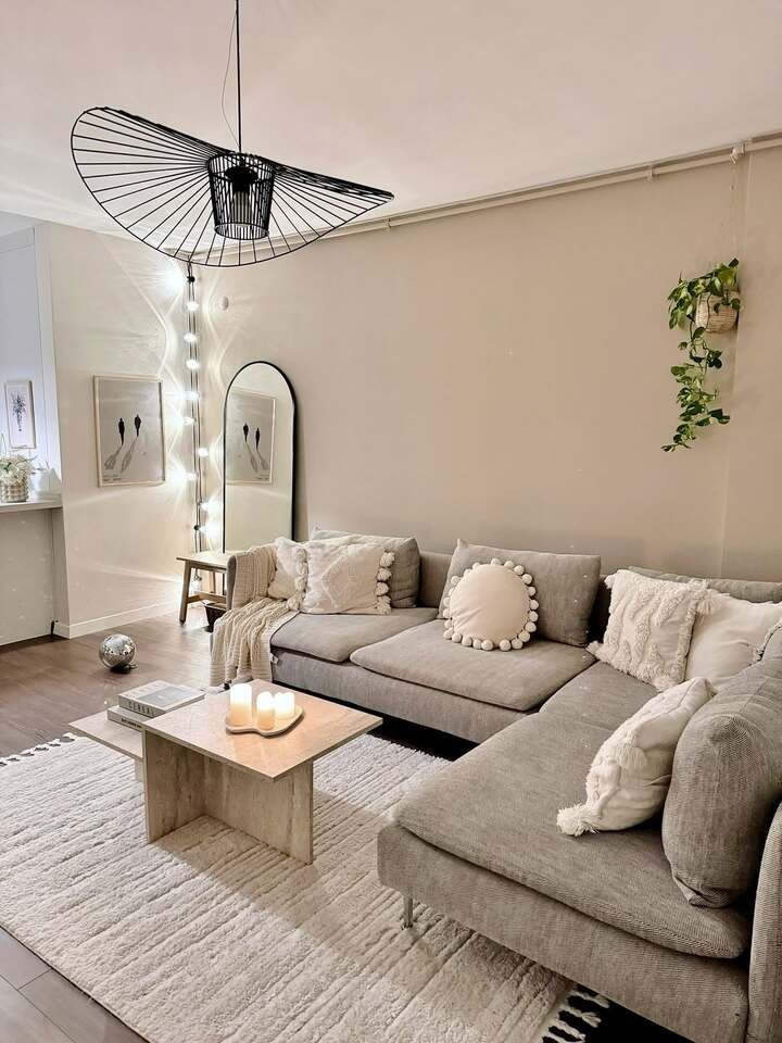 If there’s one living room that really captures the essence of a boho minimalist living room, it’s this first one. The color palette is soft and neutral with tones of grey, beige, and white. The plush sofa is inviting yet understated, and it’s accented by cozy throw pillows that have that perfect handmade vibe. What I love most about this room is how calming it feels—it's the kind of space where you could relax and unwind after a long day.