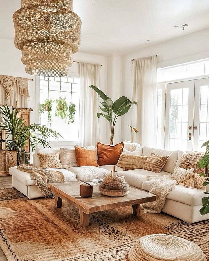 I love how the room features neutral tones with splashes of earthy color through the pillows and throws. It’s a great example of how boho elements can be introduced without overcrowding the space. This kind of room is perfect for those who want a living area that feels both light and cozy, minimal yet full of life.