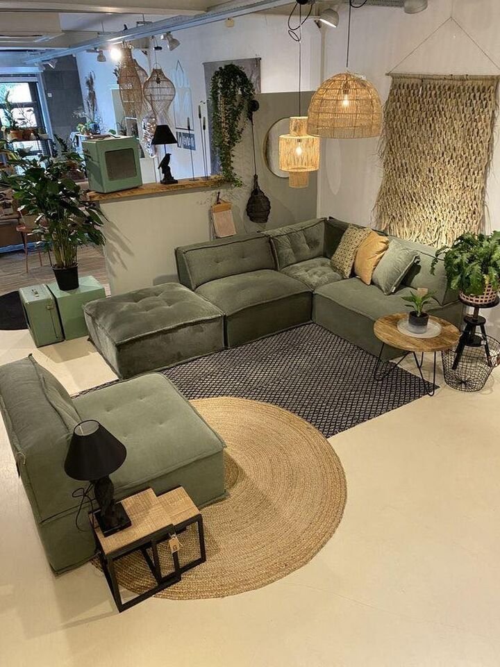 Green velvet sectional in a cozy minimalist boho corner