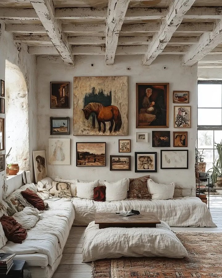 Now, if you’re a fan of vintage pieces but still want to maintain that minimalist look, this next room is definitely one to consider. The walls are filled with framed artwork, creating a gallery wall that showcases personality without overwhelming the space. I love how the artwork contrasts with the simplicity of the furniture, making it feel homey and lived-in.