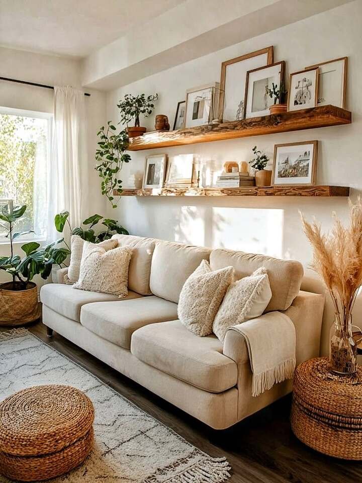 The real star, though, is those long wooden shelves stacked with art and little objects. This is a smart move if you want that curated minimalist boho living room style without committing to a big gallery wall. The frames overlap and lean casually, which makes the whole thing look like it came together over time, not in one stressful day with a hammer.