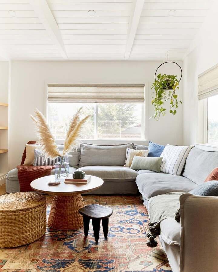 The next room feels like Sunday morning. A comfy gray sectional wraps around the corner, and it’s paired with a patterned rug that looks a bit faded, like it already lived a few lives. This is where a boho minimalist living room starts to feel more collected and less “straight from the store.”