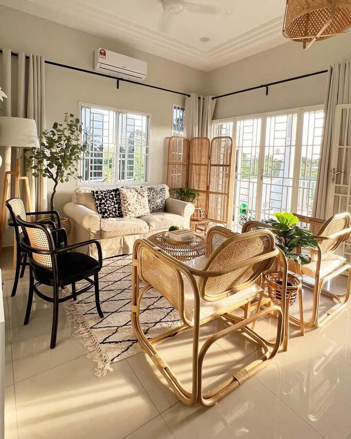 This next room is like summer in living room form. The windows let in a ton of light, which shines right on those rattan chairs. That mix of a simple cream sofa with natural wood and cane is such a classic boho minimalist living room combo.