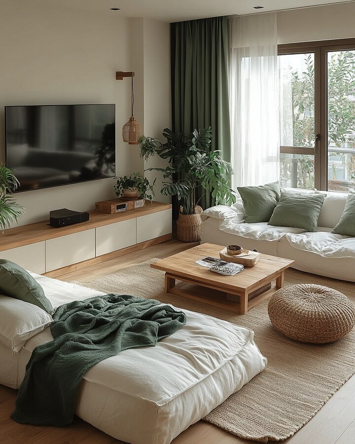 The next room is probably the most peaceful of the bunch. Low white seating, a simple wooden coffee table, and a jute rug create a very grounded boho minimalist living room layout. It almost feels like a modern tea room, but more practical.