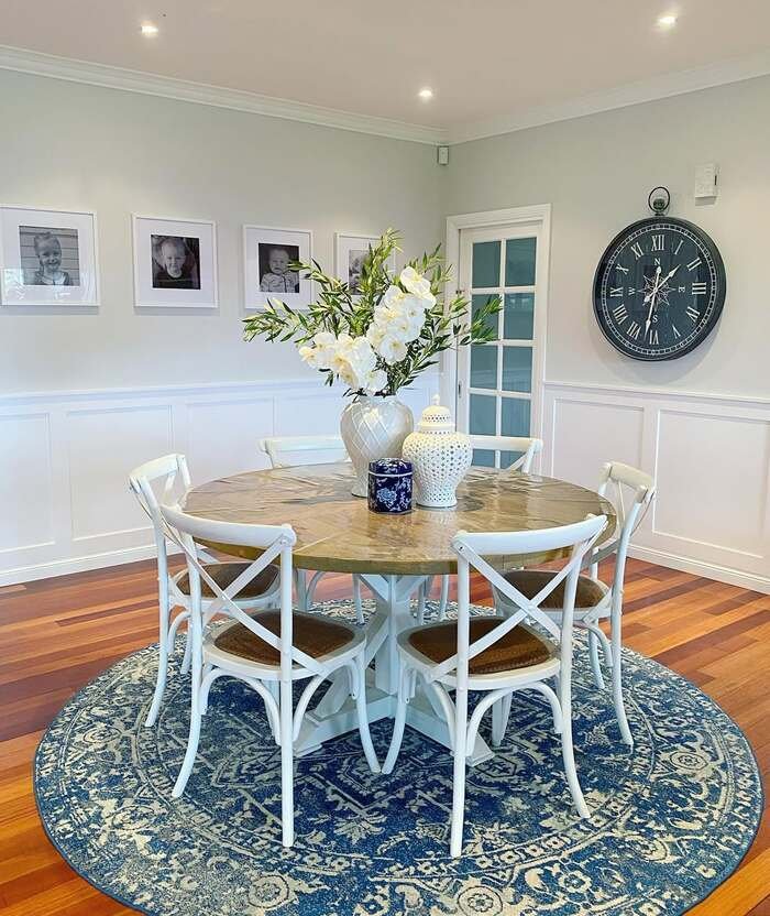 What really makes it feel casual though is the mix of simple things: the big wall clock, the family photos, the white wainscoting. It feels lived-in. If you want this look, pick one bold anchor (like that rug) and keep everything else light. My little hack: use a round rug that’s bigger than you think you need, so chairs stay on the rug even when pulled out. That’s a sneaky comfort win.