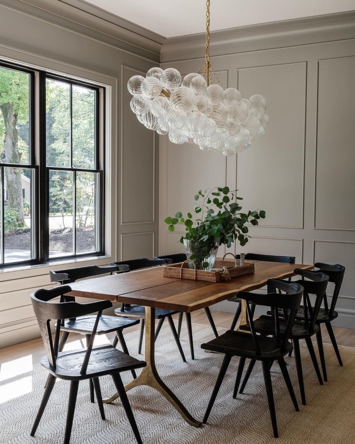 This one is polished, but still approachable. The wall molding makes it feel refined, but the big wood table keeps it grounded. Then you’ve got those dark chairs that add contrast, and the bubble chandelier is like jewelry for the room. For casual dining room decor ideas, this is how you do “nice” without feeling too formal. The chandelier is fancy-ish, but it’s playful, like a bunch of floating bubbles.