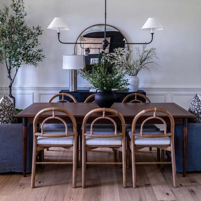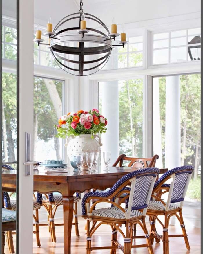 This room kinda made me want to cancel my plans and just sit there with iced tea. The giant windows are doing the heavy lifting, letting the outdoors become the “wall art.” And then those blue-trim cane chairs come in like, hello, I’m fancy but I’m also comfy. One of my favorite casual dining room decor ideas is mixing a classic wood table with chairs that have a little pattern or texture. It keeps the space from feeling like a furniture catalog.
