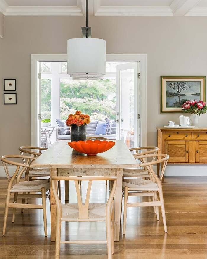 This is the kind of room I save when I’m pretending I’m a person who always has fresh flowers. The table is rustic and pale, the chairs are light, and the whole thing feels calm. Wishbone chairs are seriously one of the best casual dining room decor ideas because they’re simple, they don’t visually clutter the room, and they work with almost any table style. Plus, they just look comfortable. Like you can sit for a while and not feel like you’re perched.