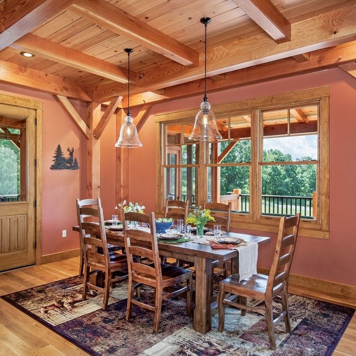 To recreate this look, focus on natural textures: wood, linen, woven rugs. The rug here is simple, but it defines the dining zone without yelling for attention. Another good move is keeping the walls mostly plain so the ceiling can shine. If you can’t do beams, you can still get the vibe with a wood table, warm lighting, and a big window view. This style feels calm and kind of “quiet fancy,” but still totally casual.