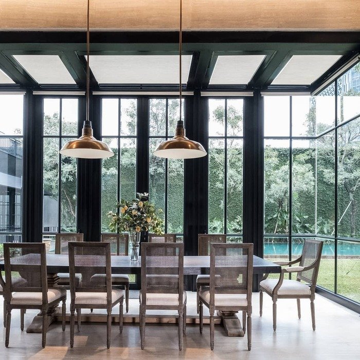 The lighting is another smart move. Two matching pendants over a long table gives balance, and it keeps the space feeling organized. For casual dining room decorating ideas, I like doing “pairs” when a room is big. Two lights, two vases, two benches, whatever. It makes things feel calm and intentional. And the chairs are neutral, so the windows stay the star. If you want a similar look in a normal house (not all of us have a glass wall, sadly), you can fake it with black curtain rods, black framed art, or even a dark mirror frame to get that same modern contrast. Still very casual dining room decor, just sharper.