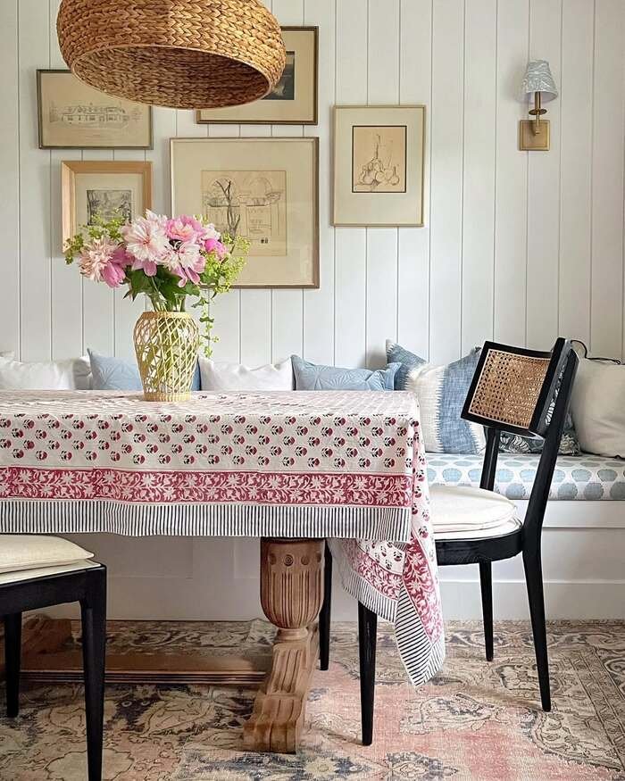 This room feels like it smells like fresh bread. The banquette seating is such a cozy move, and it’s one of those casual dining room decor ideas that makes the whole space feel more “hang out here” instead of “eat fast and leave.” I like how the seating has pillows too, because it makes it feel like a little lounge. If you’ve ever had friends stay at the table for hours, you know comfort matters.