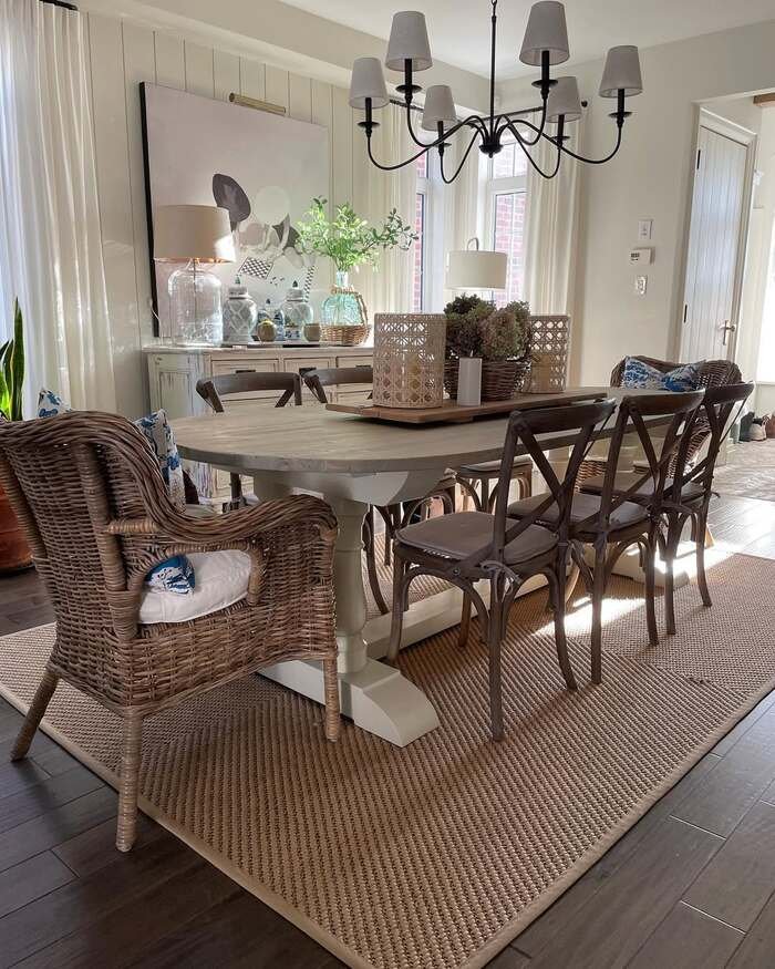 This room made me think of long talks and cold lemonade. The chunky farmhouse table is the star, and it’s paired with mixed chairs and even a wicker armchair at the end. That’s a classic trick for casual dining room decorating ideas because it breaks the “matching set” feeling. Matching sets can look stiff. Mixed seating says, “yeah we live here.” Also, that big black chandelier gives structure without being too fancy. It’s bold, but still simple.