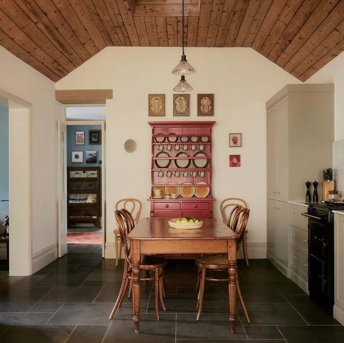 This one is cozy in a different way. The wood ceiling makes the whole room feel like a cabin, and the dark tile floor grounds everything. But the real “whoa” moment is that red hutch. I love it because it’s bold, a little imperfect, and it looks like it has a story. These are the kinds of casual dining decor ideas that don’t need a lot of extra stuff. One strong piece can carry the room.