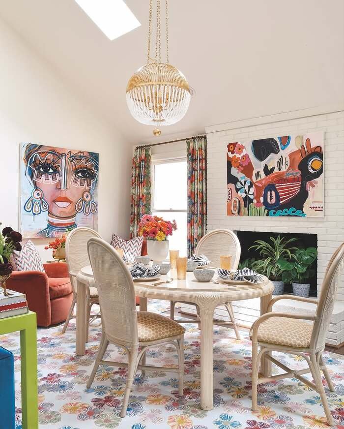 This room feels like happiness, I’m not even joking. The rattan table and chairs are light and playful, and the colorful art makes it feel creative instead of staged. This is the kind of casual dining room decor that makes you want to sit and snack, even if dinner isn’t ready. The floral rug adds softness and covers up the “life happens” mess. Also, the warm pink chair in the corner is such a fun surprise.