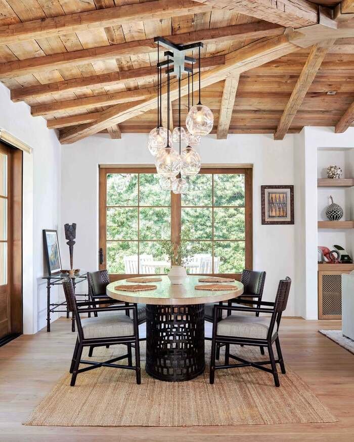 The ceiling in this one is unreal. Those rustic beams make the room feel warm and natural right away. Then the round table repeats that cozy feeling. I keep seeing round tables in casual dining room decor ideas and it makes sense. They make people lean in and talk more. The light fixture is also a big deal: glass globes feel modern but still soft, so it doesn’t clash with the wood.